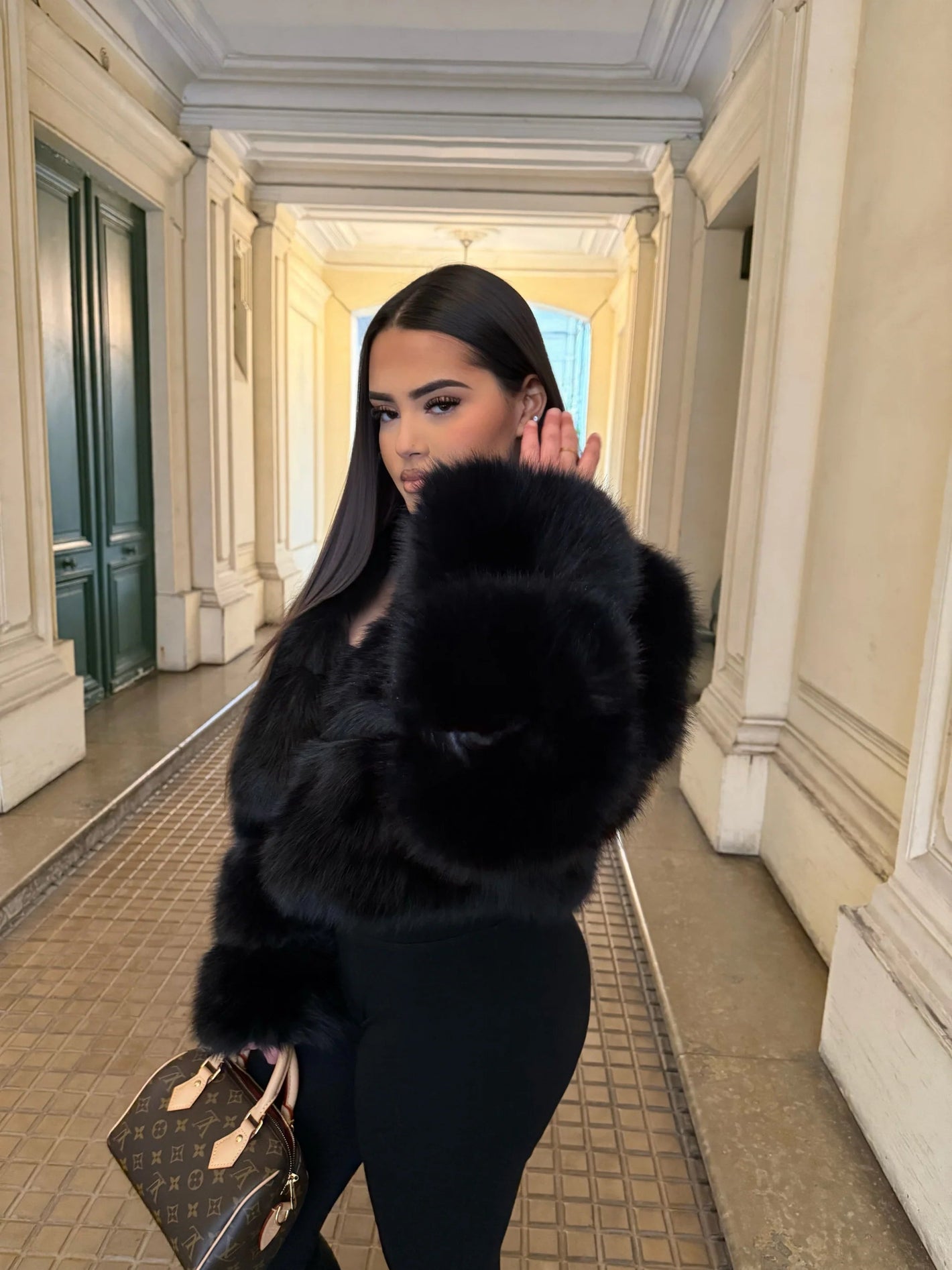 RISPARMIA IL 49%Cappotto con cappuccio in pelliccia e cintura nero